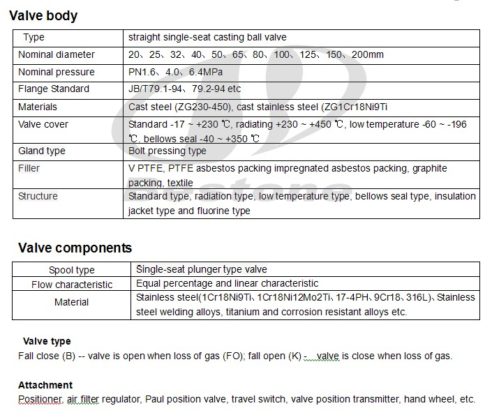 Spool with balanced, unbalanced force, allowing the pressure large, stable operation. ||| Valve guide surface, can improve the oscillation caused by eddy current and impact. ||| Compared with the single, double the ordinary control valve noise reduces about 10dB. ||| Has the advantages of simple structure, easy installation and repair. |||