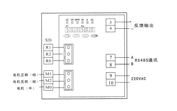 输入:电机正转,反转相线:及中线;输出:4-20mA反馈信号;(打开机壳即可看见如图示意,执行机构外壳内有端子条用于电气接线,选择适当的电源线与执行机构相连,建议使用Φ1.0(mm)导线)