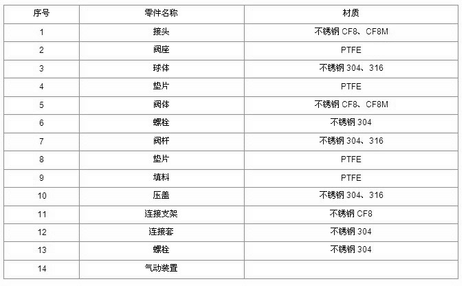 注:系列球阀结构长度及连接对夹法兰尺寸根据客户要求设计制造。 主要零件材质表 注:主要零部件及密封圈的材质亦可根据实际工况条件或用户特殊要求设计 主要外形及连接法兰尺寸BSQ614(F、H) 配套附件 ①电磁阀(DC24V、AC220V)(防爆、普通); ②空气减压过滤器(三联件); ③限位开关(防爆、普通); ④手动操作器; ⑤电气定位器(4-20MA)气动阀门定位器(0.15-0.8)Mpa; 点击下载:BSQ614气动阀系列