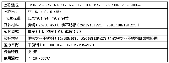 阀体材质:WCB、304、316 公称通径:DN20-300mm 压力范围:1.6、4.0、6.4Mpa 流体温度:-40℃-450℃ 适用介质:水、蒸汽、柴油、消防水、天然气、石油、化学药水等