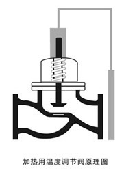 下面以加热用温度调节阀为例,结合工作原理示意图说明其工作过程:将 温度传感器插入被控介质中,当被控介质温度升高时,感温液体膨胀,作用力 克服弹簧阻力,推动阀芯向下移动,阀门趋于关闭,从而减少热媒介质流量; 反之,当被控介质温度低于设定值时,感温液体收缩,弹簧复位推动阀芯开启, 增加热媒介质流量,使被控介质温度趋于升高。循环往复,从而使被控介质温 度始终保持在设定温度值的允许范围内。