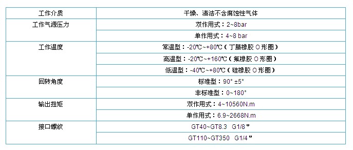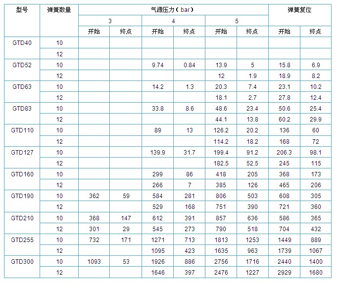 使用单作用式执行器,先确定阀门的扭矩,水蒸气或非润滑的戒指增加25%安全值;非润滑的干气介质增加60%安全值;非润滑气体输送的颗粒粉料介质增加100%安全值;对于清洁、无摩擦的润滑介质增加20%安全值,然后查找单作用式扭矩表,先查的弹簧复位终点,再查气源工作压力终点,气源压力扭矩应该大于弹簧复位扭矩,可等到准确的GTE型号,例如:气源压力只有4bar,控制一个需要扭矩180N.m蝶阀,介质为非润滑的干燥气体,考虑到安全因素,增加60%等于288N.m,首先按表查找弹簧复位终点得到相近扭矩305N.m,然后沿该列行向左查找气源压力4bar的开始扭矩584N.m正好气源压力扭矩大于弹簧复位扭矩,再沿该行向左查找其型号,选择GTE190型。