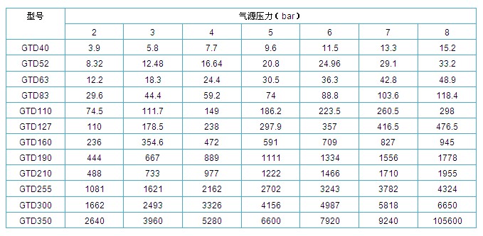 使用双作用式执行器,先确定阀门的扭矩,水蒸气或非润滑的介质增加25%安全值;非润滑的干气戒指增加60%安全值;非润滑气体输送的颗粒粉料介质增加100%安全值;对于清洁、无摩擦的润滑介质增加20%安全值,然后根据气源工作压力,查找双作用式扭矩表,可得到准确的GTD型号,例如:气源压力只有5bar,控制一个需要扭矩400N.m球阀,介质为非润滑的水蒸气,考虑到安全因素,增加25%等于500N.m,首先按表查找气源压力5bar,然后沿该列垂直查找等于或相近的扭矩数据,选591N.m,再沿该行向左查找其型号,选择GTD160型。